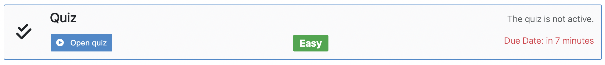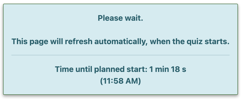 If the quiz is set to start at a specific time and the student opens it before, he/she will see a message asking to wait until the quiz starts and displaying the remaining time.