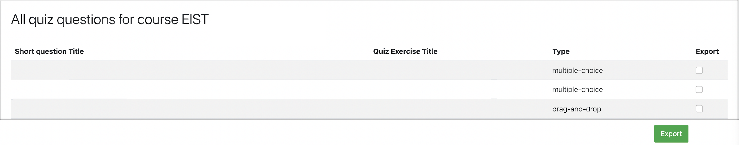The list of quizzes: Whit their ID, title, course and indicator if they are exam questions.