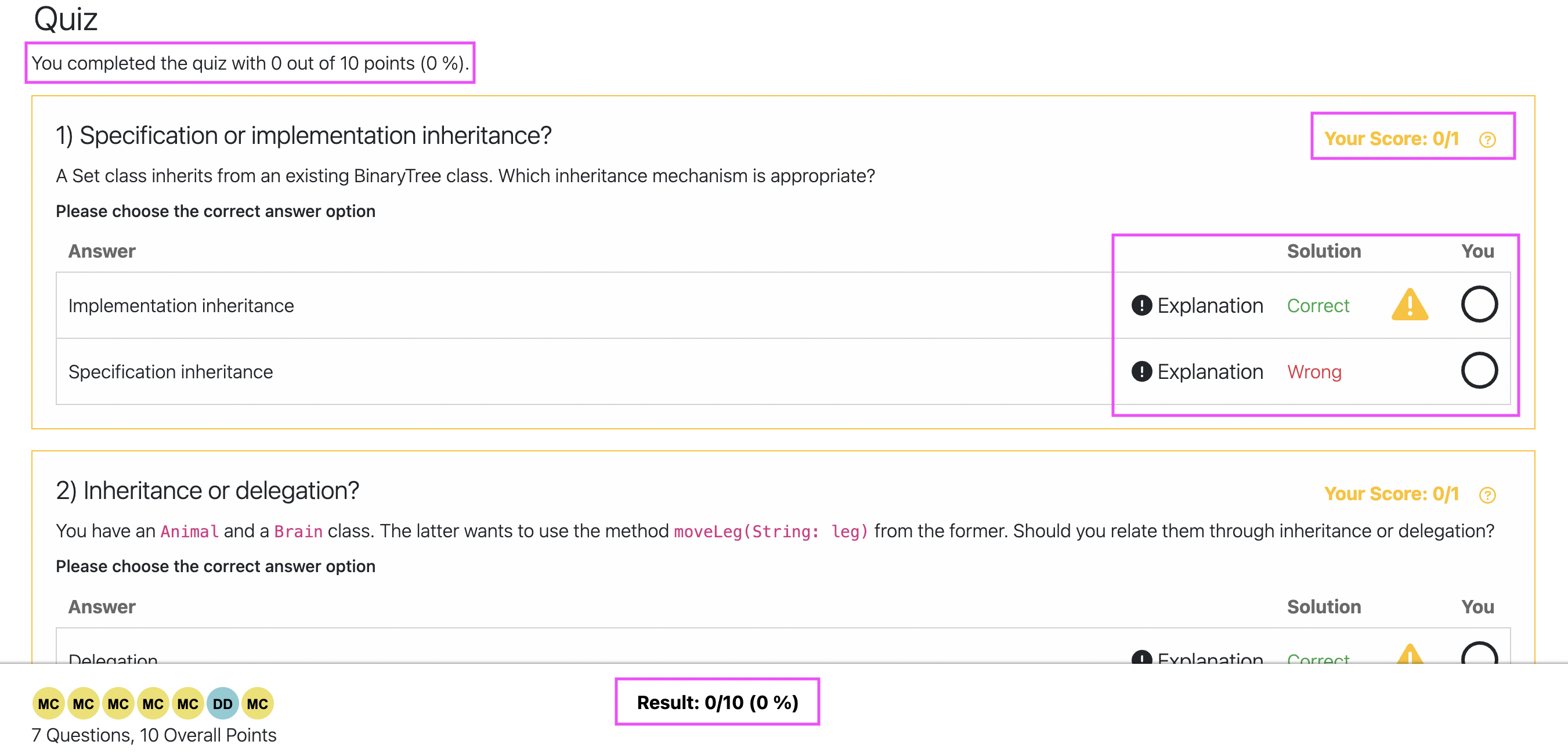 The assessment is automatic and the student can see the result of the overall quiz and of specific questions. In the case of MC questions, the solution will be displayed.