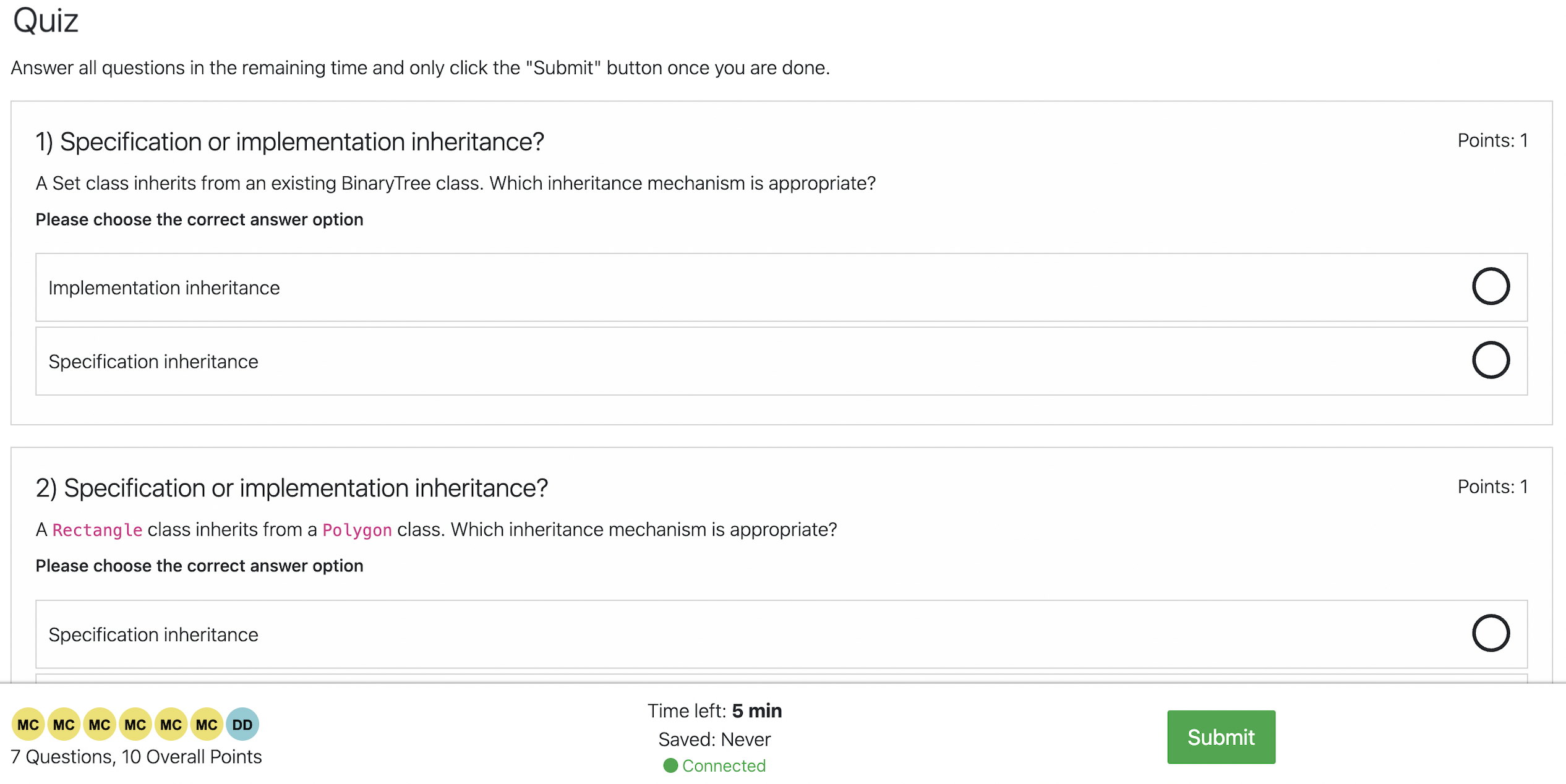 Submit button: To allow the student to submit the quiz before the time ends.