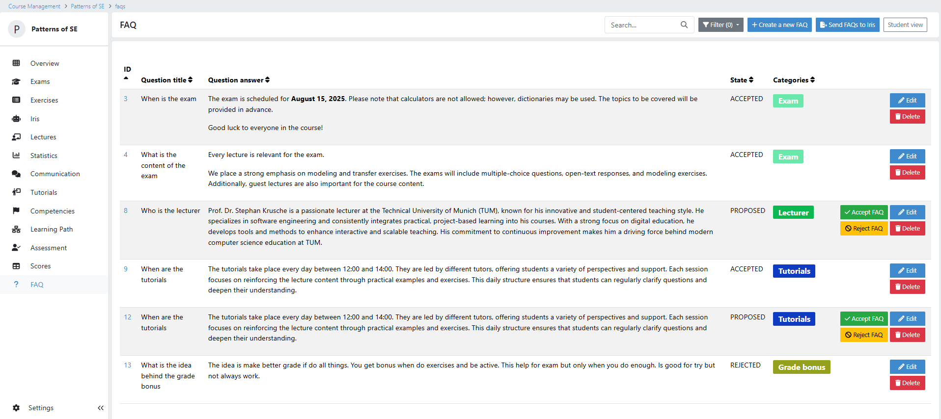 Instructors can edit or delete any FAQ. They can approve FAQs that are in the Proposed state, changing their status to Accepted.
