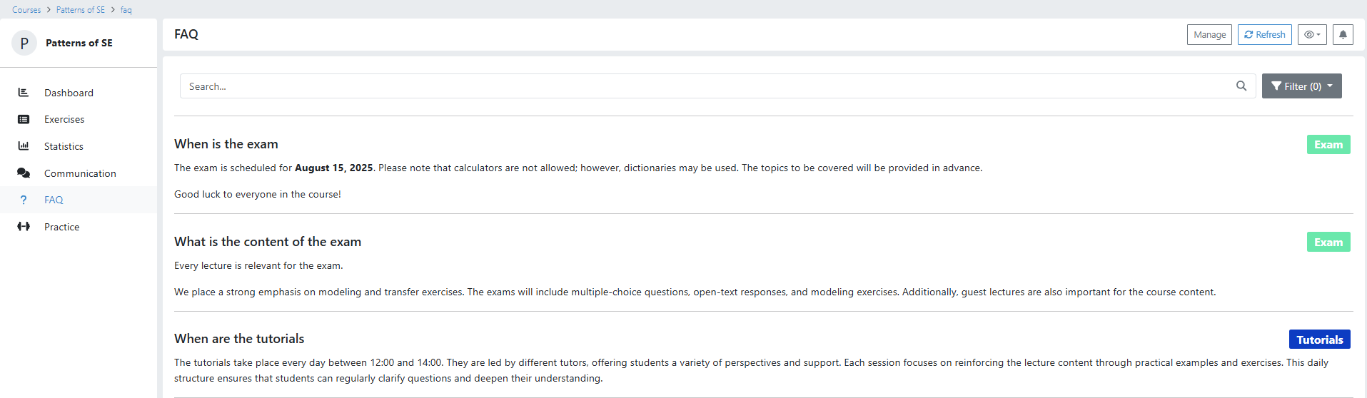 Artemis supports the coordination and management of FAQs (Frequently Asked Questions) within a course. These FAQs offer quick and clear answers to common questions from students, helping to streamline communication and make important information easily accessible.