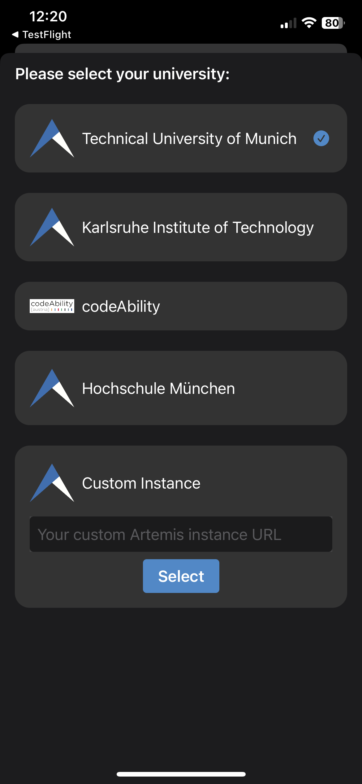 After installation, users can decide which Artemis server they want to connect to. Per default, the user can choose between the following instances: