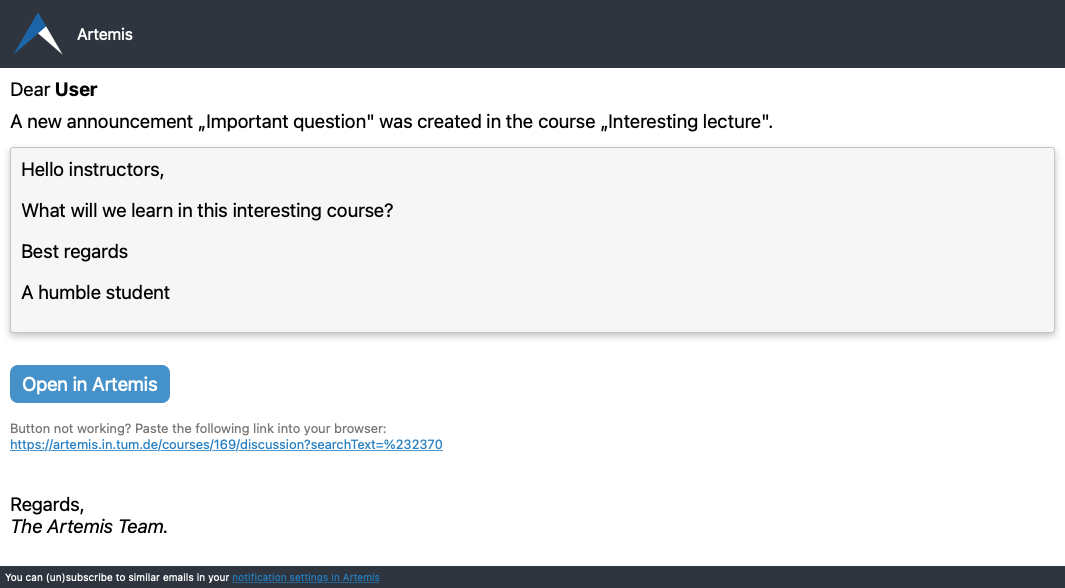 Artemis offers customizable notifications through multiple channels: web, email, and push notifications. Users can enable or disable specific notification types in their user settings. All notifications are specific to each course and can be accessed within the course interface.