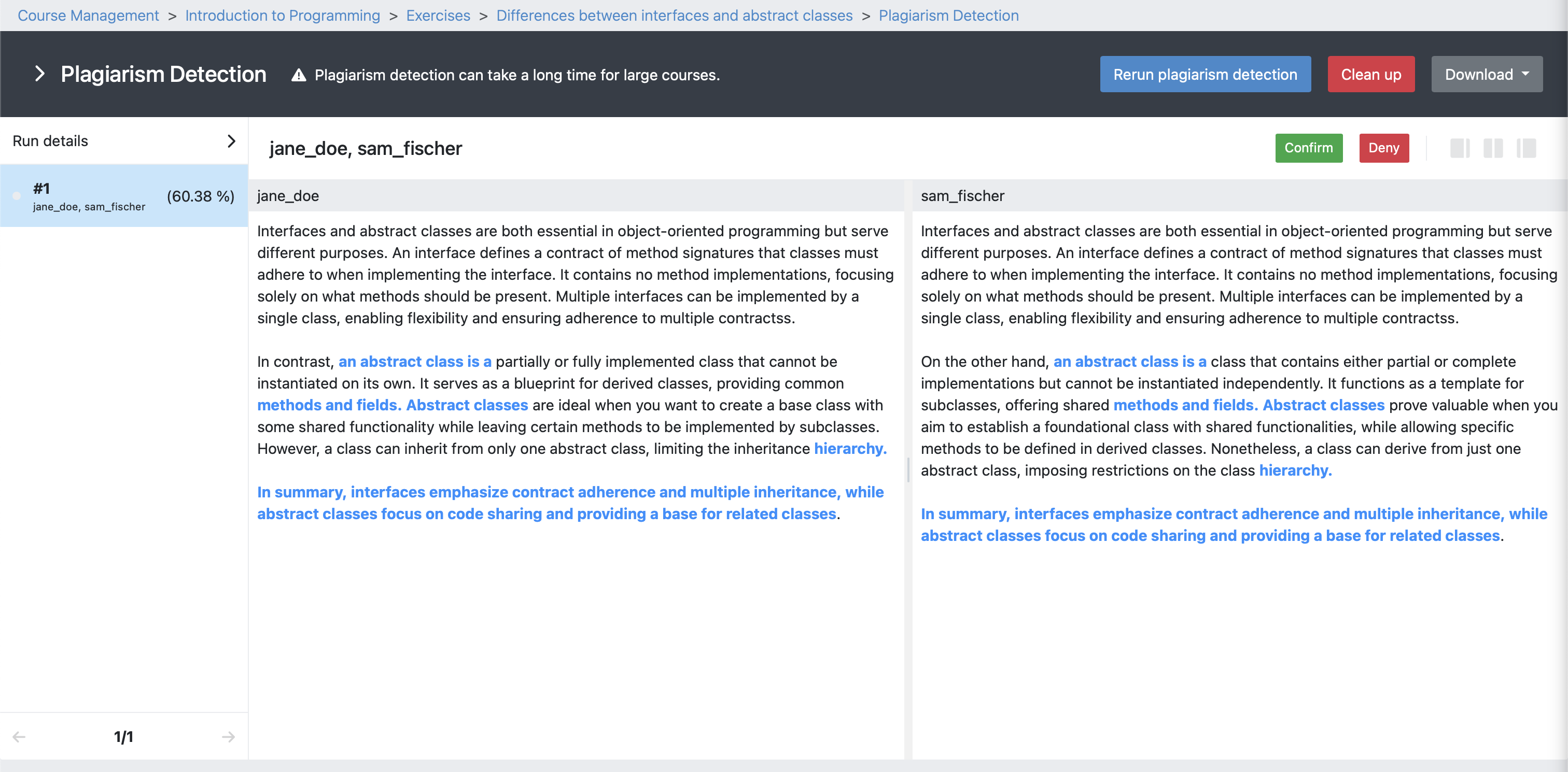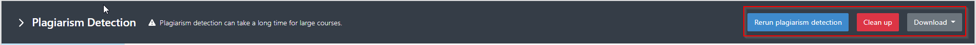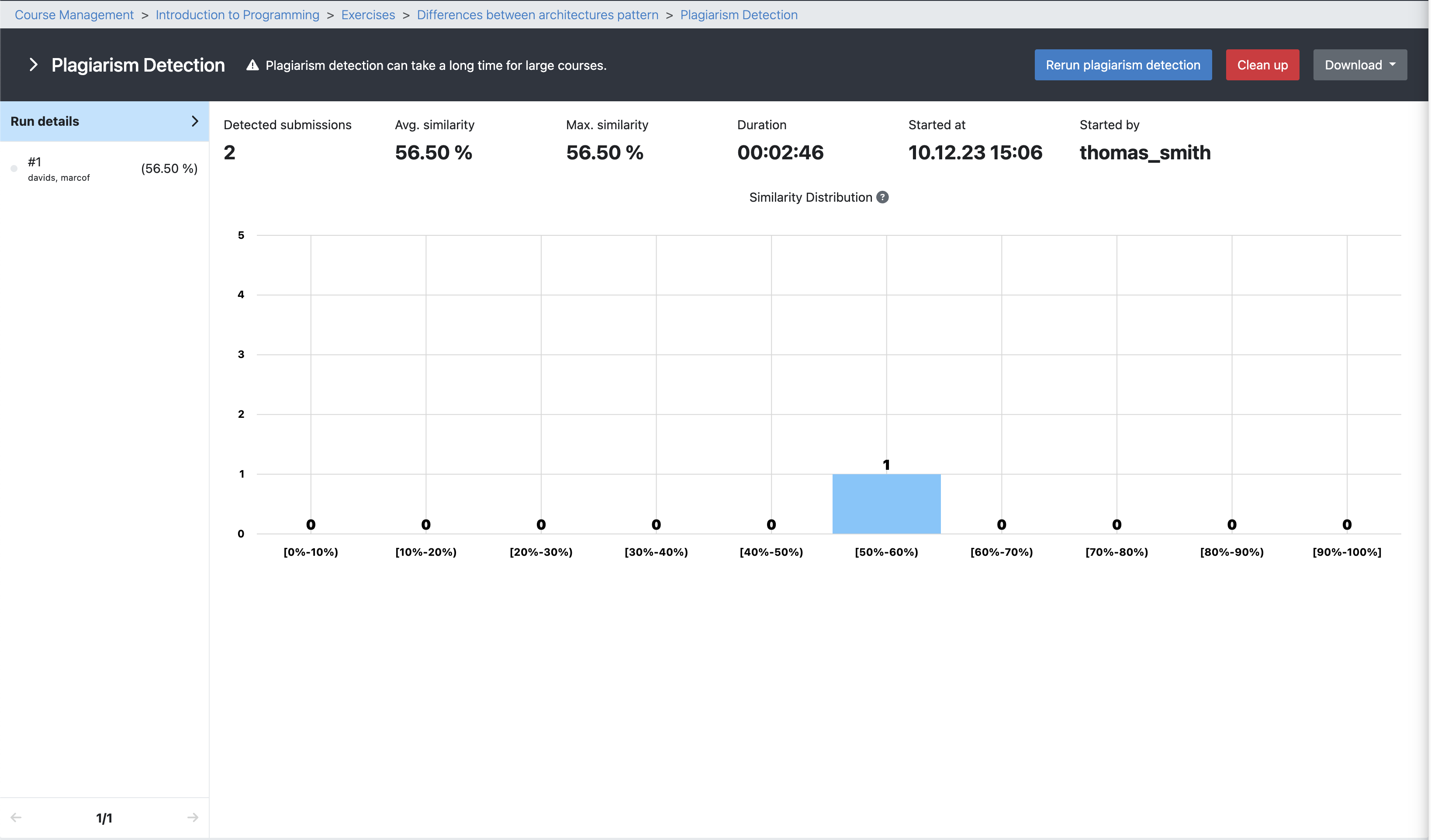 Rerun plagiarism detection: The user can rerun the plagiarism check by executing this action. It can be helpful to check for plagiarism using the different settings as described in section Settings.