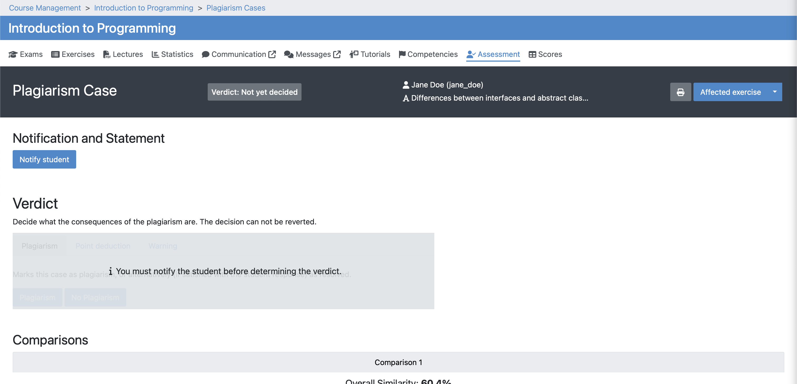 After the exercise due date, instructors can manually review all of the significant similarity plagiarism cases and decide on their verdicts. Steps at this point are equivalent to the steps in manual checks flow.