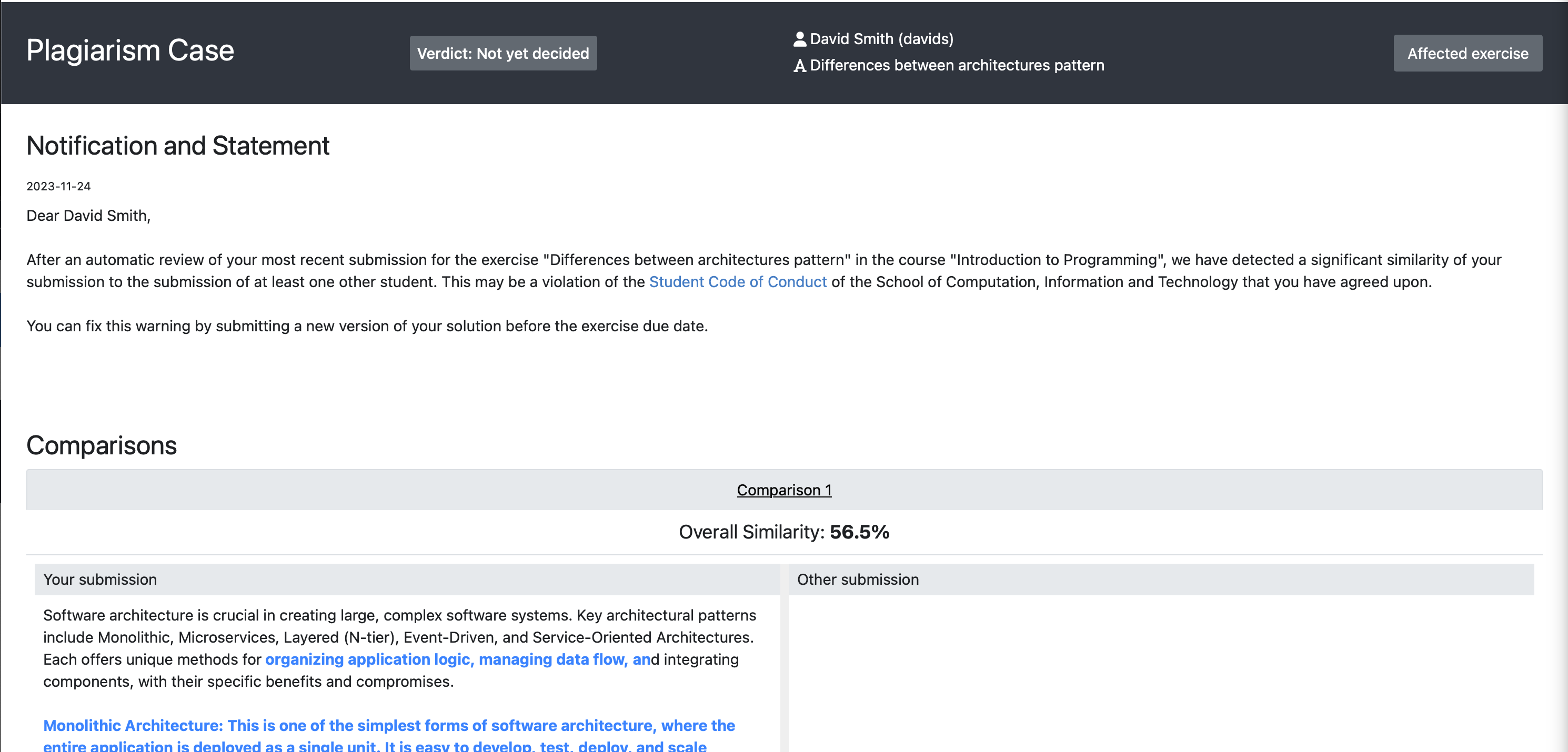 When a student submits a work for which the CPC identifies significant similarity and creates a plagiarism case, the student receives a notification similar to what is sent when instructors create a classic plagiarism case. If the exercise due date has not passed, the student can submit updated work again. The CPC will check the submission the following night and will either remove or update the significant similarity plagiarism case based on the results of the check. Before the exercise due date, a student cannot see the submissions of other students involved in the significant similarity plagiarism case.