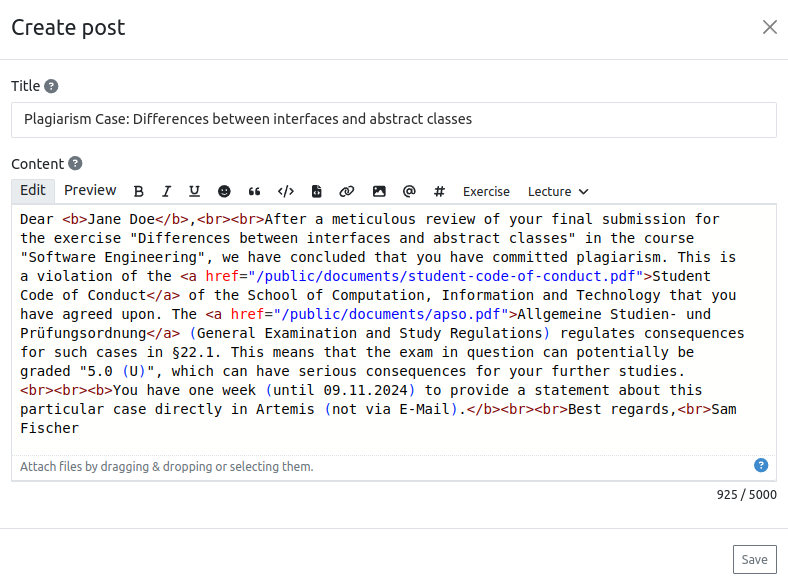 Instructors can set the response period for the significant similarity plagiarism case. - Instructor can specify for how long after the exercise due date a student will be able to submit a complaint. Default: 7 days. Min: 7 days.