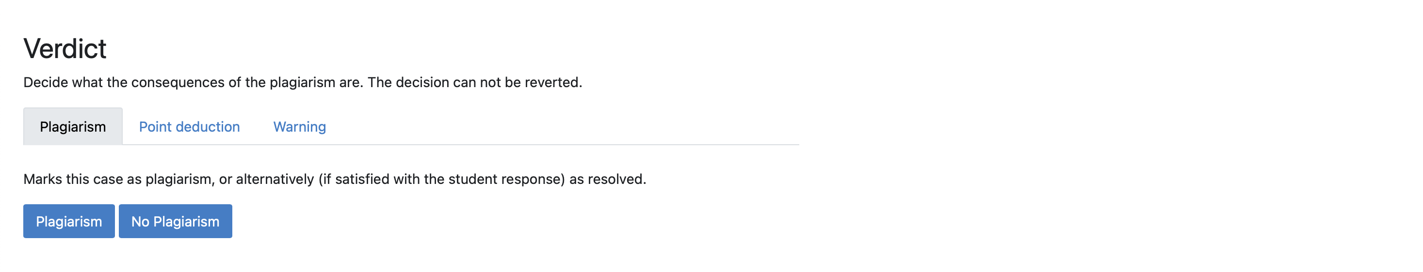 Warning. The instructor can write a warning message to the student and confirm the verdict in the dialog.