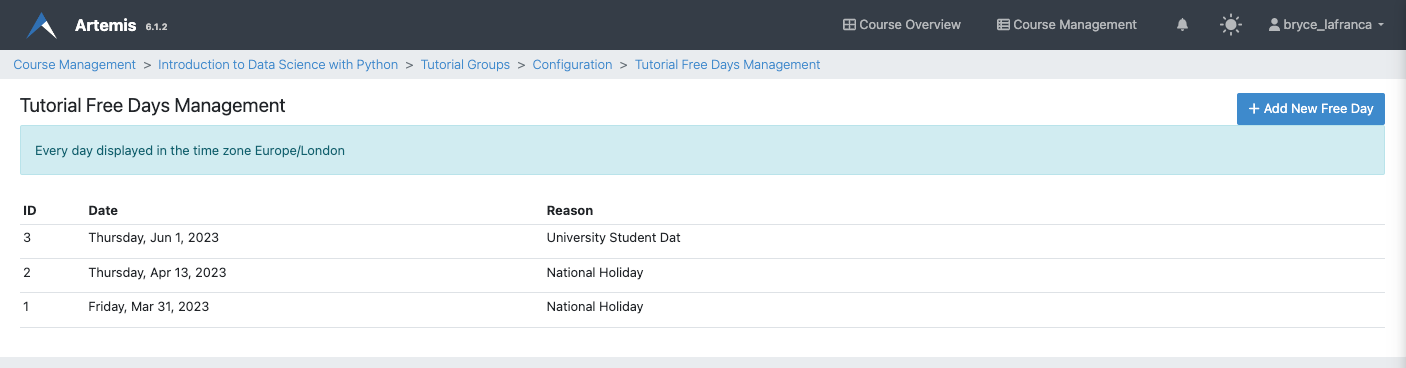 button, the instructor can define course-wide days where no tutorial group sessions are held (no matter which tutorial group). If such a day overlaps with a tutorial group session, the session is automatically cancelled and the holiday given as the reason.