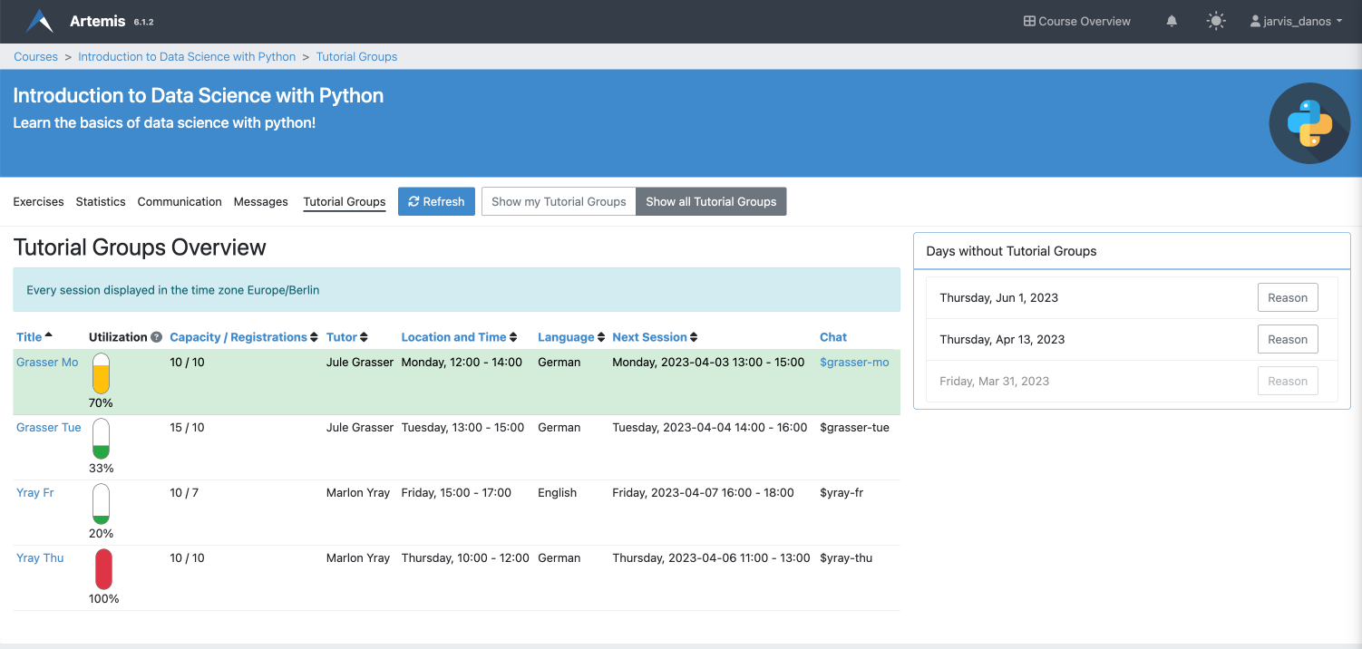 tab, students can see the main information for all tutorial groups of the course. This includes the name, utilization and responsible tutor. This page is useful if they want to switch to a less crowded group. Then they can pick one via low utilization and contact the tutor so that they get registered.