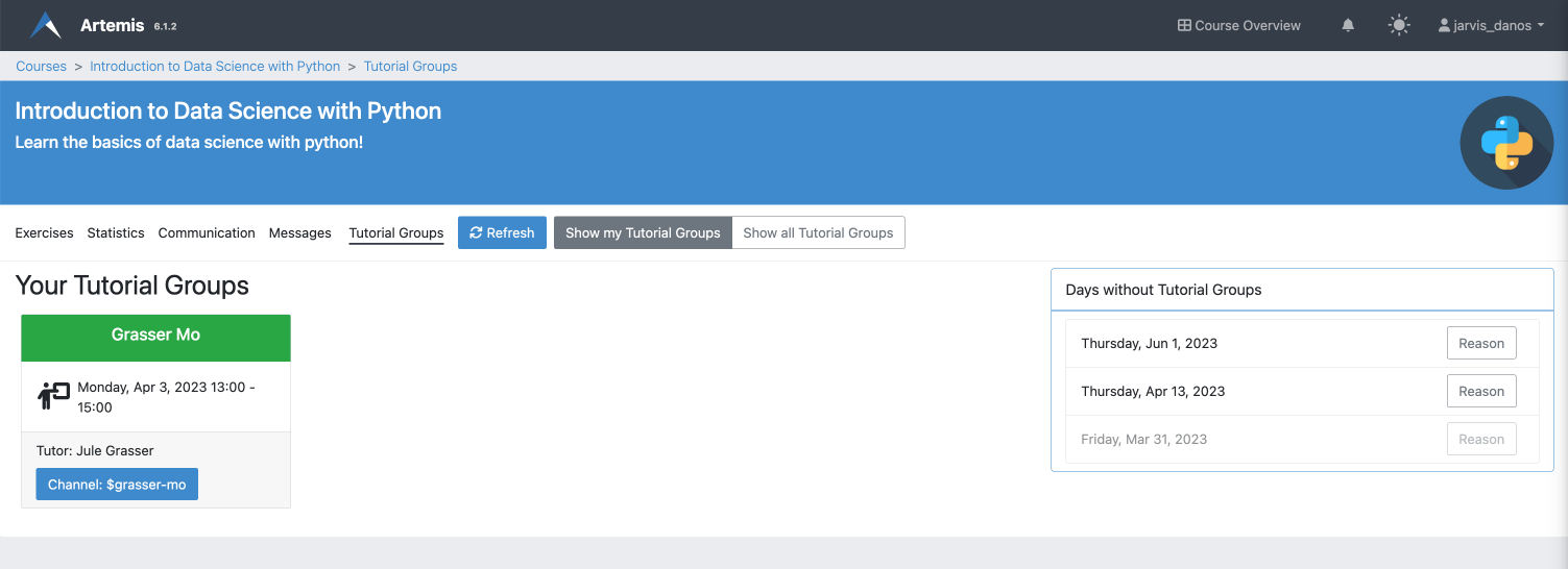 Artemis facilitates the coordination of tutorial groups in a course. Tutorial groups are a learning strategy where students teach and learn from each other in small groups (20-30). In this strategy, proficient students act as tutors and lead the groups. The tutor and the group members usually meet weekly either on campus or online. Students present their solutions to homework assignments or other tasks and receive feedback and suggestions from the tutor and their peers.