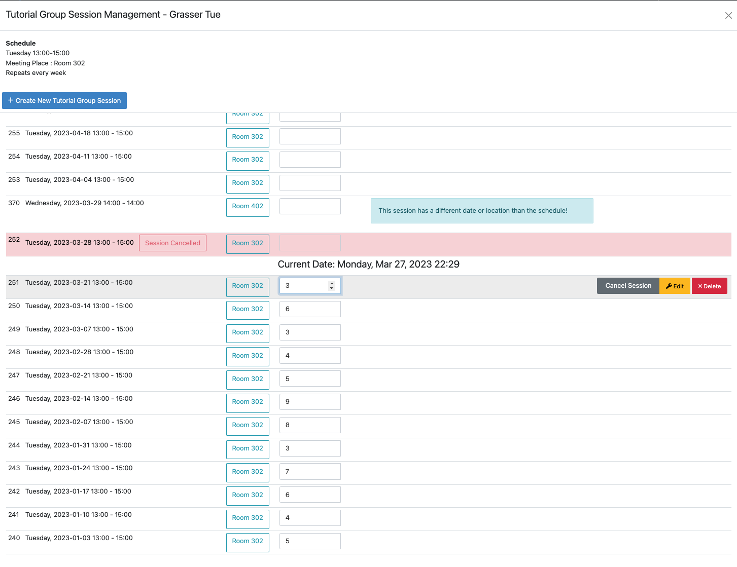 button, the tutor can view the list of sessions that are scheduled for the tutorial group. From this list, the tutor can cancel or reschedule sessions. The tutor can also create new sessions by clicking on the Create New Tutorial Group Session